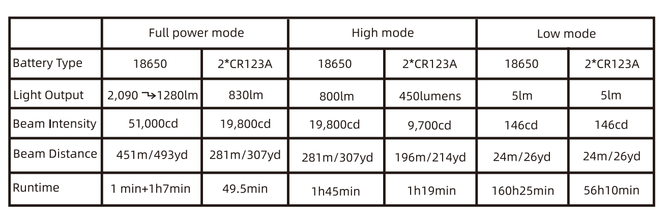 Battery type: 1 high drain 18650 lithium-ion battery or 2 CR123A batteries